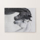 Jigsaw puzzle featuring two beautiful horses touching noses, one is white and the other is black. Perfect gift for horse lovers.