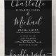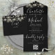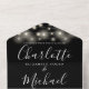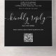 All in one wedding invitation with pretty string lights, signature style names and chic typography on a black background. The invitation includes a perforated RSVP card featuring a QR code. Designed by Thisisnotme©