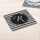 Stylish pulp board paper coasters done in a black and white horizontal stripe pattern. A black decorative circle, in the middle of the coaster, has a white single letter monogram. Personalise the letter to suit your needs. Great for anytime use and makes a nice gift idea.