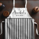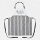 A simple, modern, personalised apron. This design has black and white vertical stripes with a stylish script text template for your name and classic style small type below for your location.