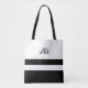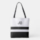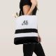 Black and white monogram tote bag. Large decorate block text monogram with large black stripes.