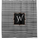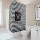 Chic monogrammed shower curtain done in a black and white horizontal striped pattern. A black decorative text area, in the middle of the curtain, has a white single letter monogram ready to personalise. Matching products are available.