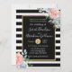 This stunning and striking wedding invitation features bold black and white stripes with a gold trim pink and dusty blue flowers and roses. The flowers really pop out and sing beautifully on this gorgeous wedding invitation.