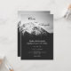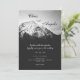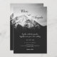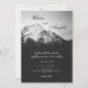 Black and white wedding under the mountains. Landscape photograph of a snow covered mountain with darkness below and white cloudy sky above. Names of the couple are in black font above the mountain in the sky and all the details are in white font below the mountain. Completely customisable and personalizable wedding products.