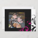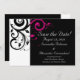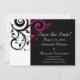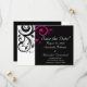 Bold and striking modern contemporary black wedding invitation set with white and magenta accents, with delicate swirl scroll leaf background. Customise online with your wedding details.