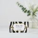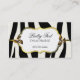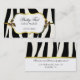 Elegant animal print business card, with a black and cream coloured zebra print as a background, on both the front and back of the card. A decorative gold tone stripe runs across the middle, on the front and backside. A gold looking framed text area has pretty graphics of gold leaves, on either side, and black customisable text ready to personalise for your business.