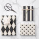 This trio of wrapping paper features harlequin, striped, and polka dot patterns using distressed black and vintage white colours.