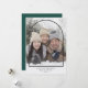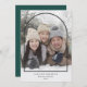 This modern holiday photo card features a large photo and a simple black arch overlay. The arch is centred on a full photo that is orientated vertically. Personalise with your favourite family photo, a custom Christmas greeting, and your names and year at the bottom. On the back of the card, you'll find room for more photos and/or a custom message if desired. The dark forest green background colour on the back can be changed.