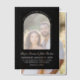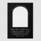 Elegant black vellum wedding invitation with an arch-shaped peekaboo frame so you can lay a romantic photo of bride and groom beneath with the informal wedding wording in white against a translucent black. Elegant fonts and delicate details in white. Peekaboo wedding invitation in vellum with an arch shape for your photo in black and white.
