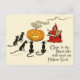 Funny, vintage Halloween illustration of a witch in red informing a jack-o-lantern and five black cats that "Class in the Black-Art will meet on Halloween!"
