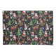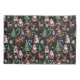 Christmas-themed pattern featuring Santa Claus, reindeer, snowmen, elves, Christmas trees, candy canes, and snowflakes on a black background