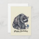 Adorable sitting black bear with butterfly illustration with Happy Birthday text, on cream background