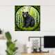 Black bear sitting in a lush green forest surrounded by birch trees, framed by decorative foliage.