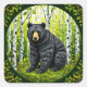 Black bear sitting in a lush green forest surrounded by birch trees, framed by decorative foliage.