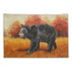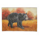 A cute black Bear taking a stroll through a field of bright fall coloured foliage.