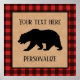 In the centre is a silhouette of a black bear with text templates above and below in black lettering so you can personalise. this image and text is inside a burlap square with a black border. The background pattern is a lumberjack red and black buffalo plaid.