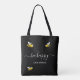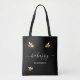 Decorated with happy, smiling yellow and black bumblebees. A chic black background. White hand lettered script and the text: Bee Happy. Personalise and add your name.