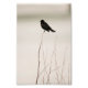 Art features a single shadowy black bird perched atop a tall thin winter barren branch in moody grey fog. Original art by Featherfall Studio.