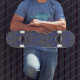 This awesome skateboard features a swirly black, blue and yellow abstract pattern. If you stare at it carefully it looks as though it is moving like a series of ocean waves.