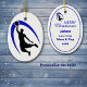 This personalized ornament is great for the basketball player, coach, or fan! It shows a dramatic black silhouetted basketball player in process of dunking the ball, with a bright blue swirl design behind him. The back of the ornament has a smaller version of the image, with four text fields for your custom text. *Clip art used in this design is copyrighted by Encore Software, Inc., which permits use to its licensors. All rights reserved.