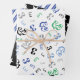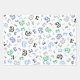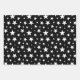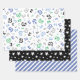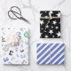 Birthday wrapping paper sheets with matching patterns in different shades of blue, green, and black. One sheet features the birthday boy's age in a fun pattern. One sheet has white stars on black. And one pattern has white and blue stripes.