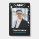 Vertical employee ID personalised with photo, name, and department or title with a black background and molecule graphics in white and blue. An employee ID badge for a science role. Science themed employee ID badge printed with photo.