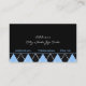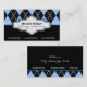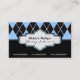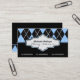 Black blue white argyle trendy business cards, featuring a sky blue and white argyle pattern. The bottom part is of solid black colour. A black and a blue stripe separate the two parts. Your company/name is typed on an elegant damask label with black and pink outline. Cute, modern design with a retro feel to it, that can be used for many business fields such as interiors, hairstylist, fashion and more.