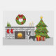 Destei's original cartoon illustration of a cute black and white colour Boston Terrier breed dog. The dog is placed in a festive room that has a fireplace and a lot of Christmas decorations including a green Christmas tree, some red stockings and a wreath with a red bow on it.