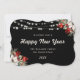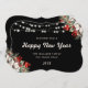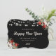 Elegant black New Year card featuring a watercolor painting of poinsettia, holly and red berries along with string lights. Easily personalize online.