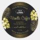Make a lasting impression with this elegant and exotic product label design featuring shimmery gold hawaiian flowers and palm leaves on a black background. A cool palm leaf shadow matching to the shimmering dark brown border frame.