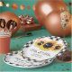 Rustic black and white buffalo plaid floral wedding paper plates featuring sunflower flowers and string lights on a black and white chequered background. Matching items available to complement these wedding paper plates. Easily personalise these plates to any occasion.