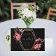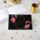 A black background, rose gold foil text. Decorated with a geometric frame and florals in burgundy and pink. Personalise and add your names and the wedding date.