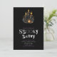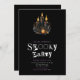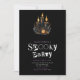 This Halloween party invitation sets a hauntingly elegant tone with its black background and the words "Spooky Party" in a creepy magazine or horror cut-out font in white and purple. The font adds a chilling touch, perfect for a Halloween celebration. At the centre of the invitation are three black candles, surrounded by black and gold foliage and ornaments, creating a mystical and atmospheric design.