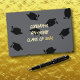 Graduation party guest book for son's graduation. Dark grey book cover with black caps and gold foil text on front. Optional black pages, or choose white. Sample text is, "Congrats (name) class of (year)" in uppercase printing. Books come in a few sizes.