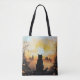 A Picturesque Scene: This tote bag showcases a picturesque autumn evening with a captivating design. A black cat perched on a rooftop, overlooking a charming small town as the sun sets, creating a serene yet mysterious atmosphere.