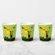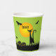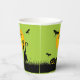 Bats in the sky fly above a green-eyed black cat and leering jack o' lantern on these Halloween paper cups. MATCHING items in our collection.