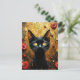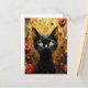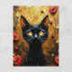 A cute black cat with large yellow eyes and red roses on a gold and brown mott;ed background