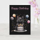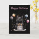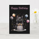 A black cat celebrating a birthday with cake and balloons. Suitable for a birthday for anyone