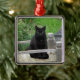 This beautiful ornament shows a black cat sitting next to a lantern on a rustic wooden bridge surrounded by green plants and flowers. Blackie, the cat, goes out to this bridge each morning and sits before beginning his day.