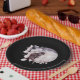 Paper plates with a watercolor painting of a black cat and a light purple and pink floral bouquet. Standing in front a a large full moon. Stylish and magical.
