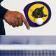 A retro-looking illustration of the face of a yellow-eyed black cat appears in a moon-like circle in this original Halloween-appropriate art by Richard H. Fay.