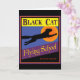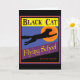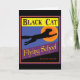 Black Cat Flying School Retro Halloween Art. A magical black cat flies across a spooky blue sky with an orange moon. Vintage style Halloween art design by AngelCityArt