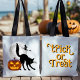 Tote bag for teens or adults during the Halloween season. White bag with black cat, jack o'lantern, flying witch and full moon design on the front. Large "trick or treat" wording on the back in orange can be removed or changed. The special characters in the wording will be removed. The design is perfect for any kid or teenager who likes to trick or treat. White shows up better at night too. Or use it to shop during the holiday season.
