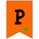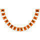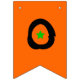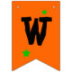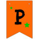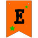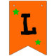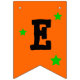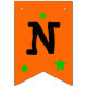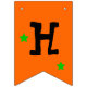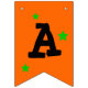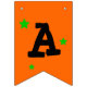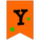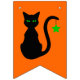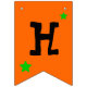 A banner with "Happy Halloween" in black on an orange background. Cats appear on two of the flags. Green stars are sprinkled around the letters.