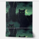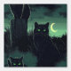 A sleek black cat with glowing green eyes sitting on a fence post, with a crescent moon in the background