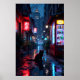 Black cat in urban alleyway at night with vibrant poster