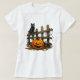 The design of the black cat and jack-o'-lantern is a classic symbol of Halloween, evoking feelings of whimsy and fun. The addition of the wooden fence adds a rustic touch to the design, enhancing its charm. This t-shirt is perfect for those who appreciate a cute and festive look for Halloween, adding a touch of sweetness to your outfit.