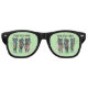 These retro party glasses have three fun black cat musicians playing music with their violin, saxophone, and guitar wearing colourful ties, shoes, and gloves in pink, green, and blue on a light green background. Customise your text with the template.