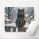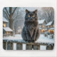 A fluffy black cat with striking yellow eyes sits atop a snow-dusted wooden fence, surrounded by a picturesque winter village