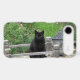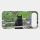 This phone case shows a black cat sitting next to a lantern on a rustic wooden bridge surrounded by green plants and flowers. Blackie, the cat, goes out to this bridge each morning and sits before beginning his day. Note: This phone case is available for many different phones. Please check to make sure the image fits well on your choice.